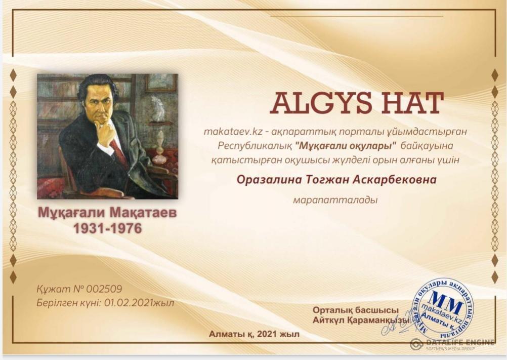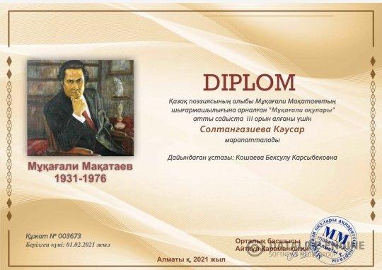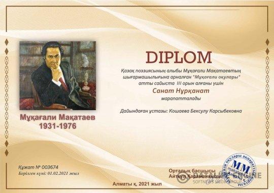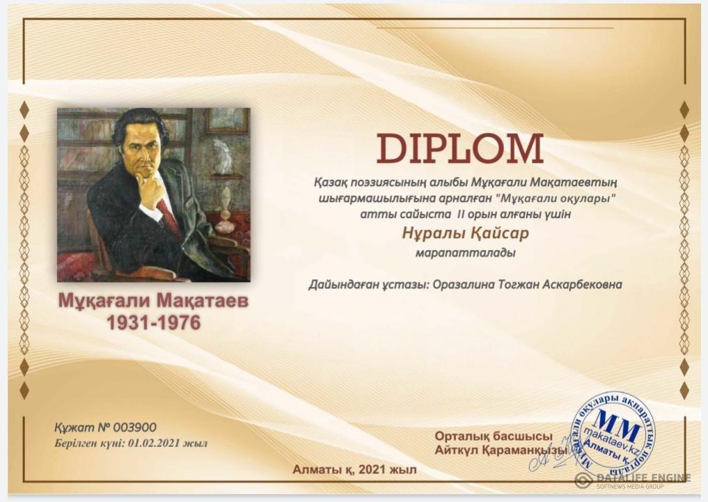 №195 жалпы білім беретін мектеп » Ақпарат » №195 ЖББ мектептің оқушылары 2021 жылдың ақпан айында өткен Қазақ поэзиясының алыбы Мұқағали Мақатаевтың шығармашылығына арналған "Мұқағали оқулары" атты сайыста жүлделі орынға ие болып дипломмен марапатталды. Жауапты: Оразалина Т., Кошаева Б.