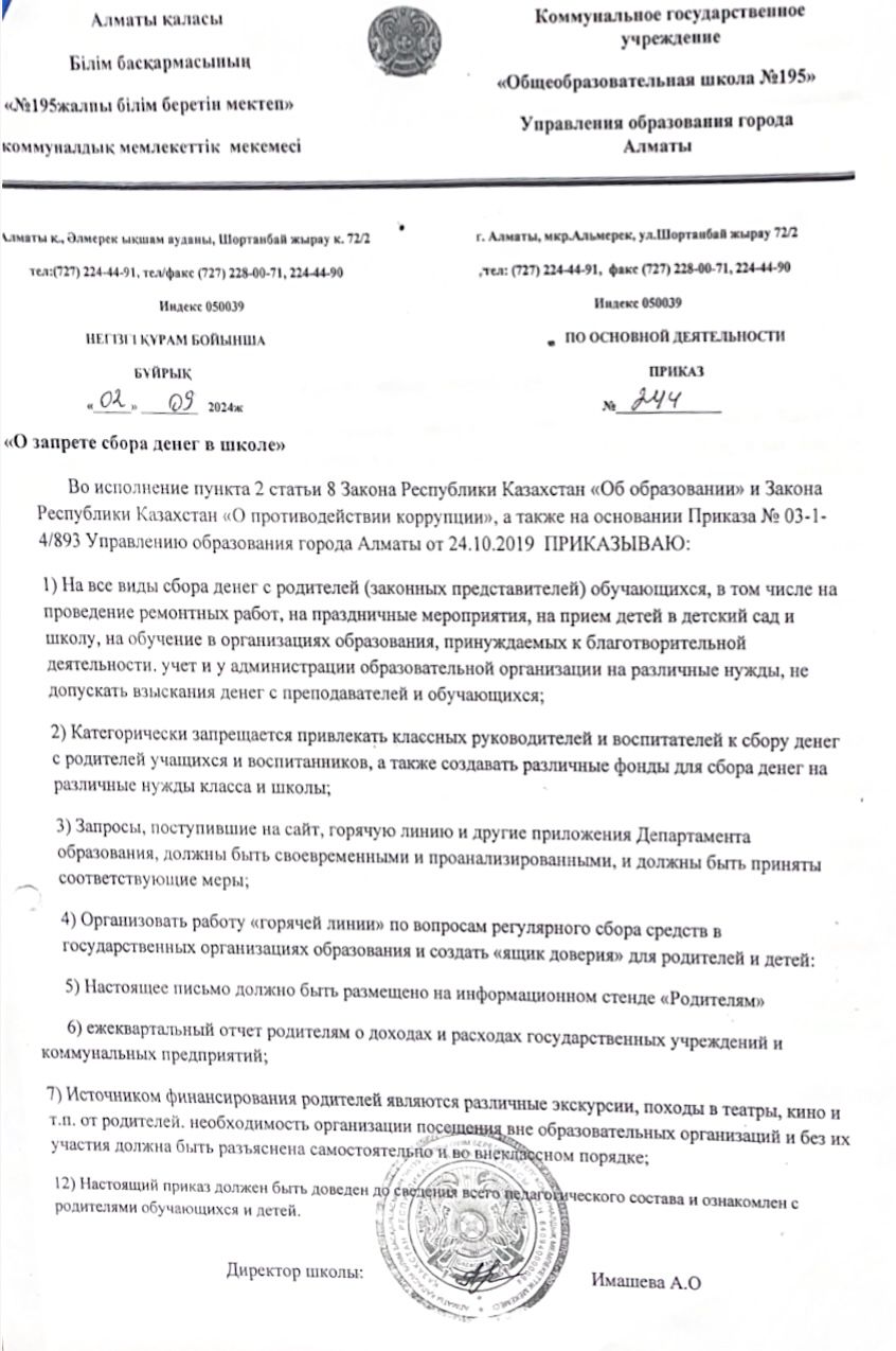» » » Мектепте ақша жинауға қатаң тыйым салынған туралы бұйрық 2024-2025 оқу жылы/ о запрете сборов денег в школе 2024-2025 уч.год