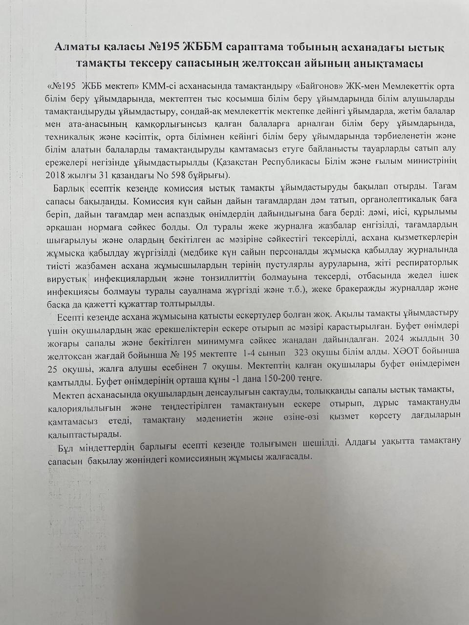 » » » Тамақтану сапасының 2024-2025 оқу жылының желтоқсан айының есебі